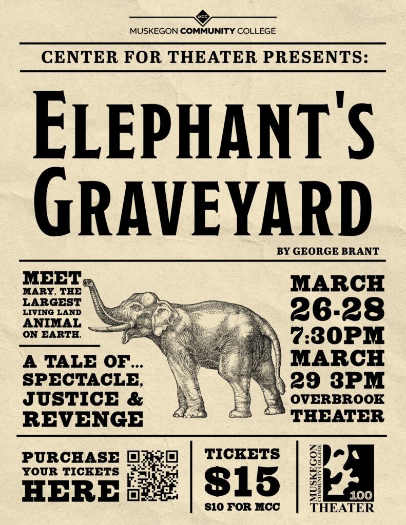 Muskegon Community College’s Center for Theater continues its “Centennial Season” with a provocative play based in the 1910s called, Elephant’s Graveyard, by George Brant, playing March 26-29, 2026 at the Overbrook Theater.