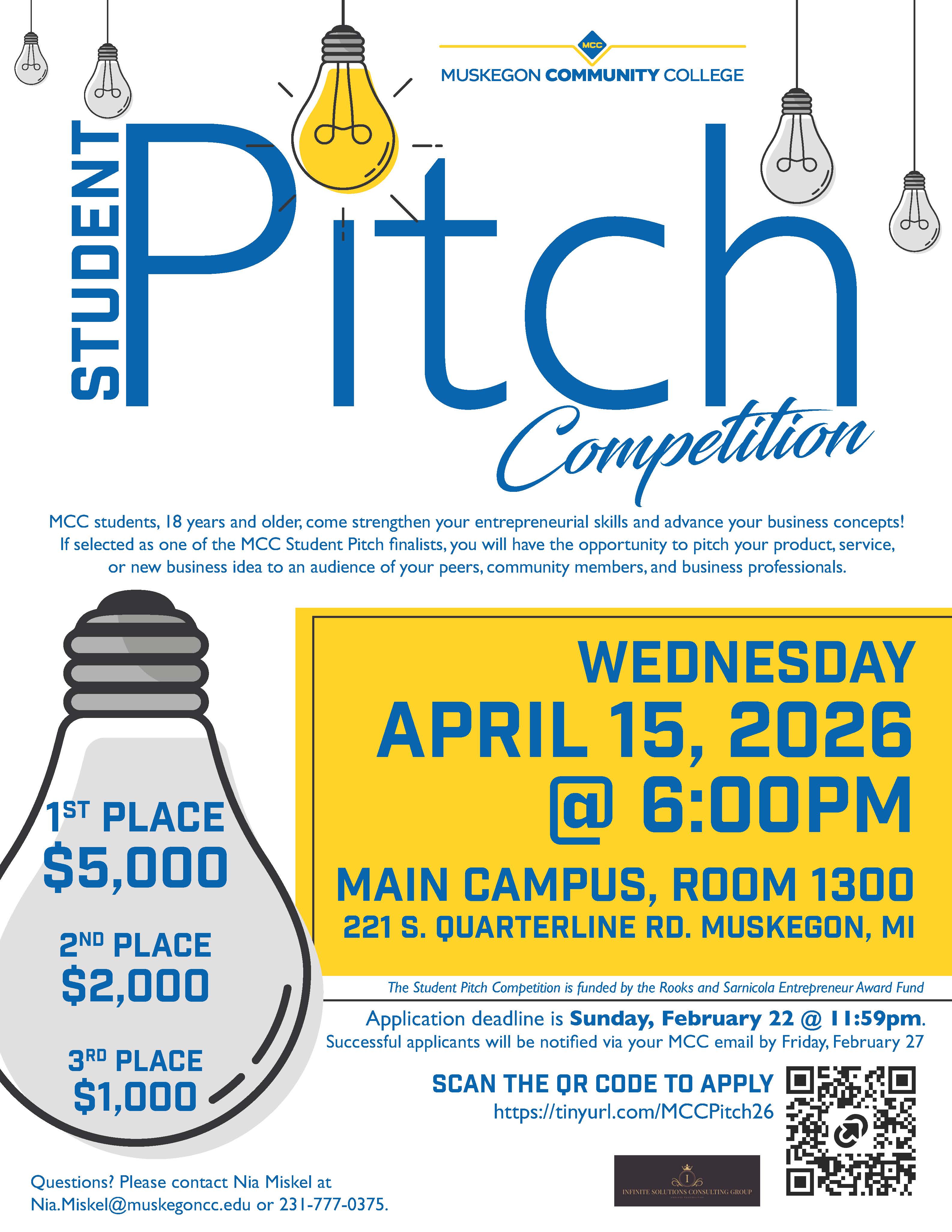Muskegon Community College (MCC) is calling on students who have a great idea for a new business to enter its Pitch Competition, designed to inspire and support the next generation of entrepreneurs. This event invites MCC students, ages 18 and older, to present their innovative product ideas, services, or business concepts for a chance to win cash prizes totaling $8,000. The competition will culminate in a live showcase on Wednesday, April 2, 2025, at 6:00 PM in Room 1300 on the MCC Main Campus, located at 221 S. Quarterline Rd., Muskegon, MI.