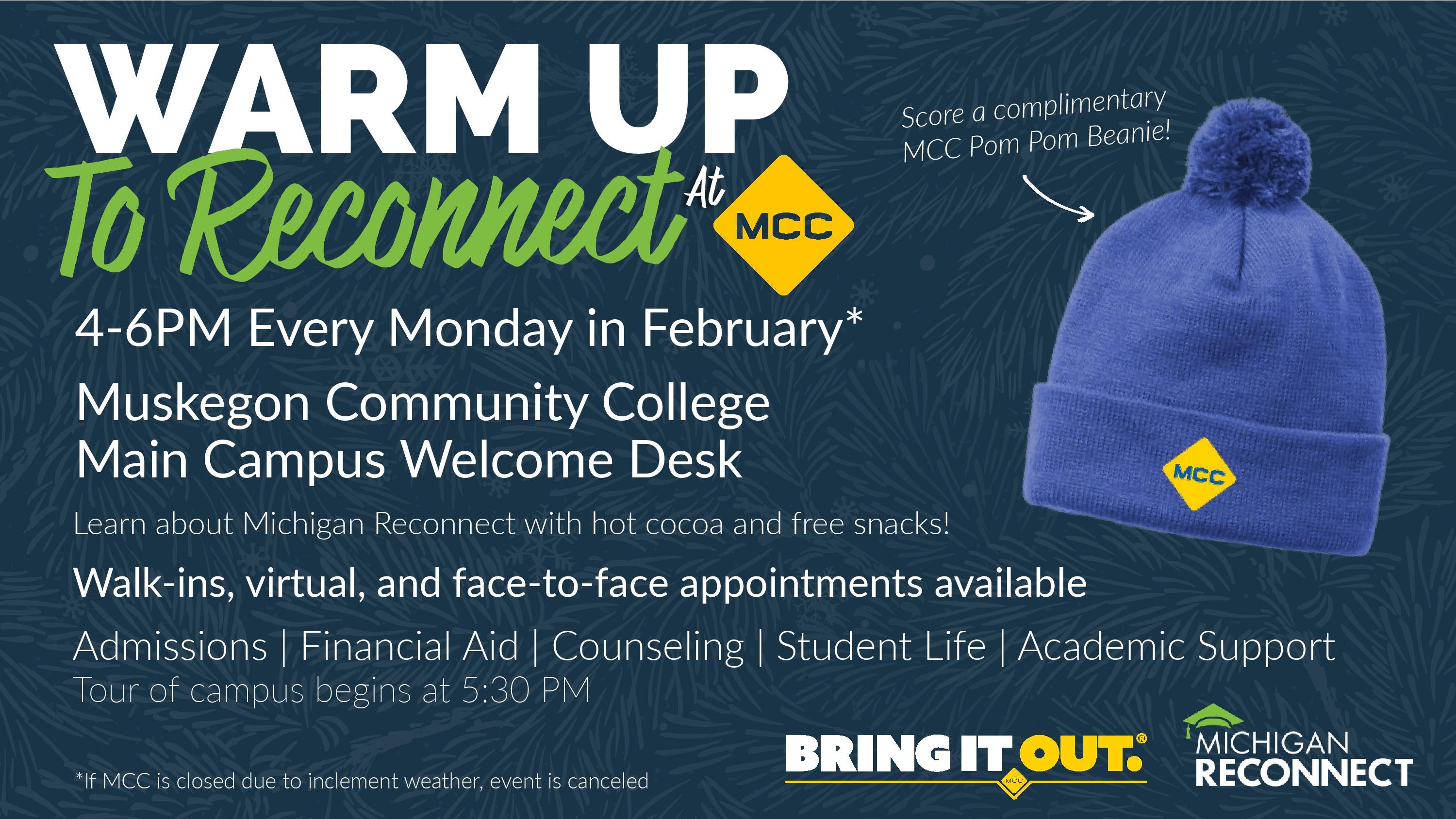 Add to Calendar Monday, February 9, 2026 4:00 pm America/Detroit Warm Up To Reconnect at MCC MCC Welcome Desk: 221 S. Quarterline Rd. Muskegon, MI.