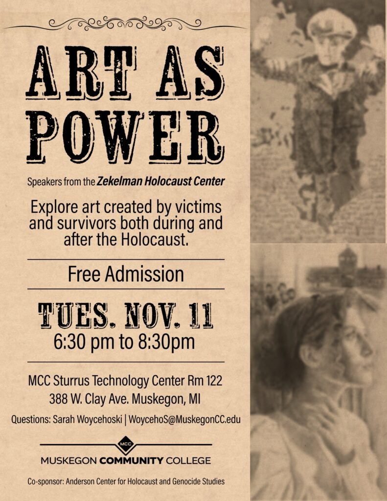 Muskegon Community College (MCC) invites the public to a moving evening of art, history, and reflection on Tuesday, November 11, from 6:30 – 8:30 p.m. at MCC’s Sturrus Technology Center, Room 122 (388 W Clay Ave, Muskegon, MI 49440).
