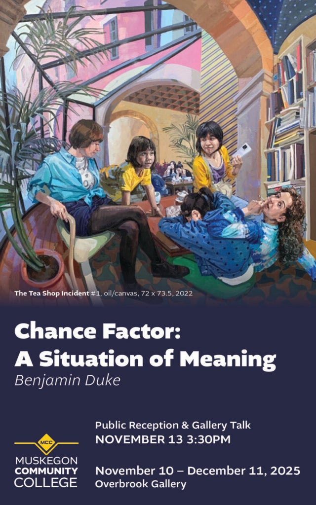 Muskegon Community College’s Overbrook Gallery is preparing to welcome acclaimed artist Benjamin Duke for an exhibition of his works titled “Chance Factor: A Situation of Meanings”. The showcase will be on display November 10 through December 11, 2025*, while the campus and community are invited to attend the Opening Reception and Gallery Talk with the artist on Thursday, November 13, from 3:30 to 4:30 p.m. in the Overbrook Gallery.